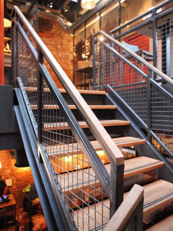 Перед установкой лофтовых лестниц, ещё на этапе проектирования, большое внимание уделяется точному расчету нагрузки и несущей способности конструкции так как она сама по себе тяжелая из-за металла в составе. Плюс нужно понимать где и в каких условиях она будет эксплуатироваться, будут ли по ней подниматься тяжелые предметы или только ходить люди. Ограждение Лофт 10 гармонично вписывается в интерьер многоуровневого ресторана и рассчитано на плотный поток посетителей. Перилла ограждения выполнены из такого же дерева, что и ступени лестницы. Боковые блоки ограждения состоят из прямоугольников с крупной сеткой внутри. Небольшие зазоры между блоком ограждения и периллами, и блоком с основанием лестницы визуально добавляют воздушности конструкции.
